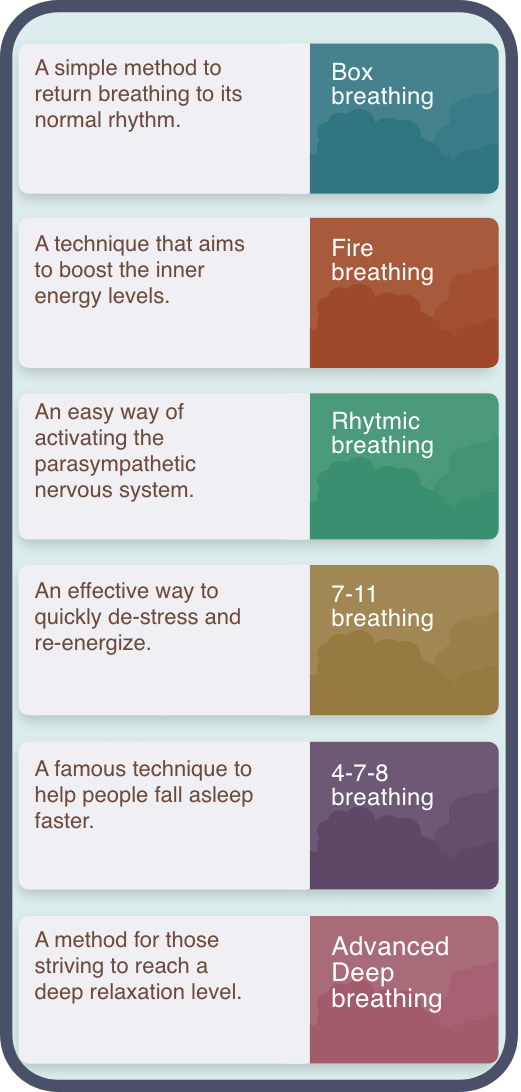 Carefully curated exercises with step-by-step guidance will help you to start breathing mindfully. Exercises are split into Goals and Therapy categories, which will help you find a practice that will be most comfortable and useful for you.